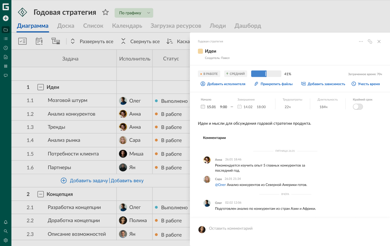 В нашей альтернативе MS Project у менеджера все находится на одном экране. Задачи, время, ресурсы, зависимости, изменения и участники, их сделавшие, — все в одном месте прямо перед вами.